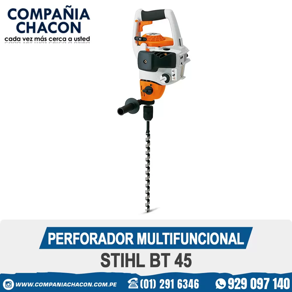 Para trabajos específicos, tanto en construcción como en la agricultura y donde la posibilidad de contar con electricidad escasea, usted podrá confiar en el perforador multifuncional STIHL BT 45. Un equipo versátil, ya que da la opción de usarlo como taladro para maderas con broca de 1” o perforador de suelo con barreno de 5”. El perforador multifuncional STIHL BT 45 es ideal para construcción de cercos, instalación de postes delgados o plantaciones menores. Cuando se requiere precisión y ahorro de tiempo, el perforador multifuncional BT 45 es el indicado.